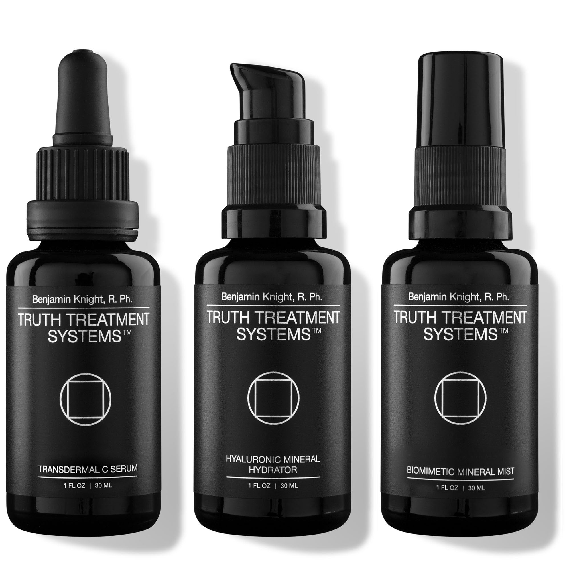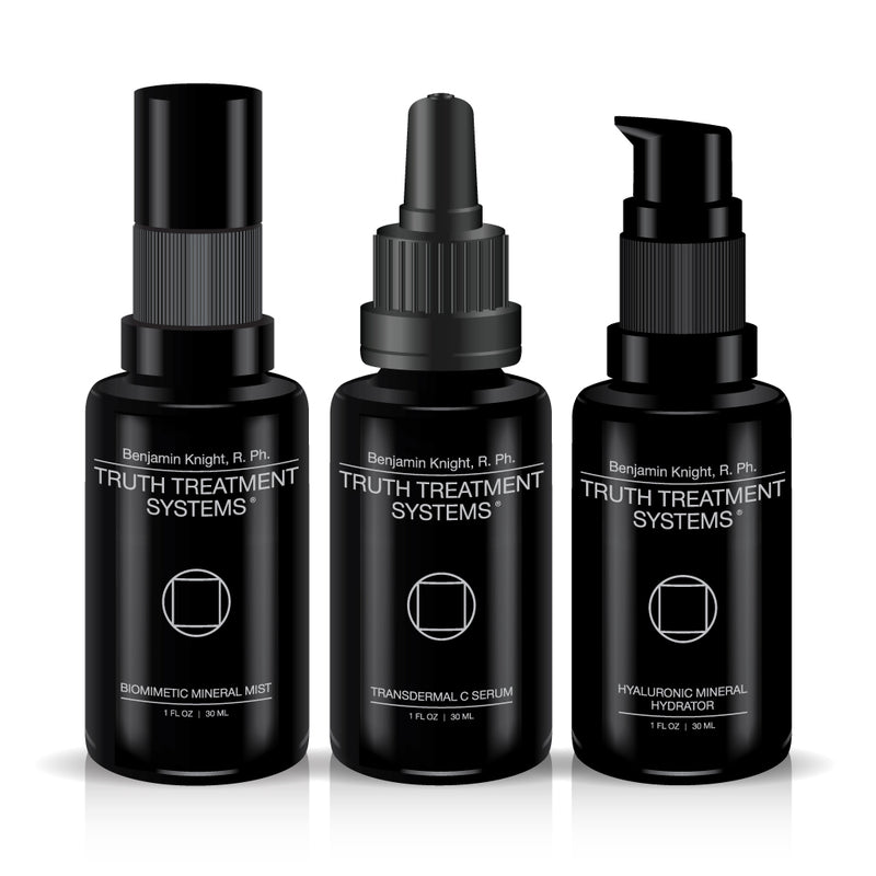 This powerful system combines Vitamin C, Polyelectrolyte Minerals, Hyaluronic Acid, and Amino Acids to boost collagen production and rejuvenate the skin. Free of unnecessary additives, Truth Trifecta™ delivers visibly firmer, hydrated skin with a youthful glow. Simply blend Transdermal C Serum™, Hyaluronic Mineral Hydrator™, and Biomimetic Mineral Mist™ for radiant results.